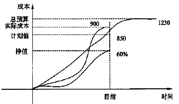 已知某综合布线工程的挣值曲线如下图所示:总预算为1230 万元,到目前为止已支出 900 万元,实际完成了总工作量的60%,该阶段的预算费用是850 万元。按目前的状况继续发展,要完成剩余的工作还需要(58)万元。
