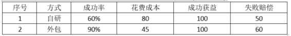 请应用决策树分析技术,分别计算自研和外包的期望货币价值,并判断项目组选择外包方式是否正确。