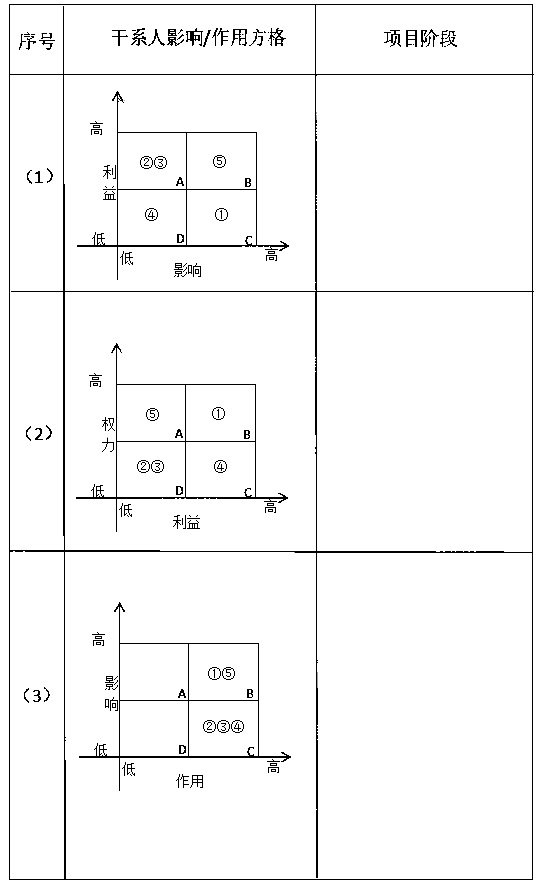 (1)结合案例中的以下干系人,请分别写出干系人影响/作用方格对应的项目阶段(将正确答案填入答题纸对应栏内)。