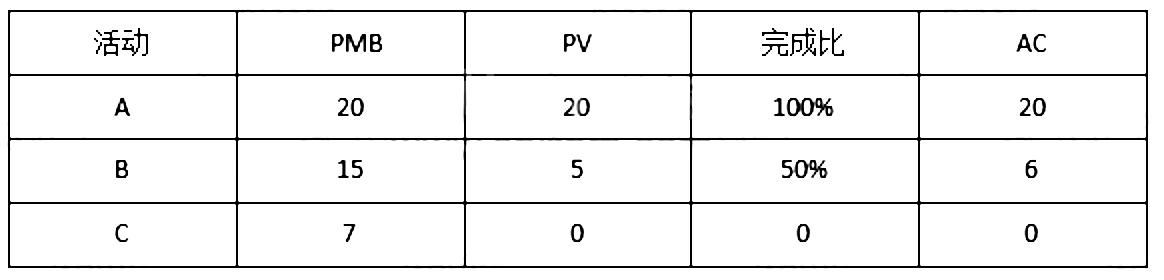 某软件开发项目包括A,B,C三项活动,目前各活动的相关数据如下(单位:万元),则该项目绩效处于()状态。