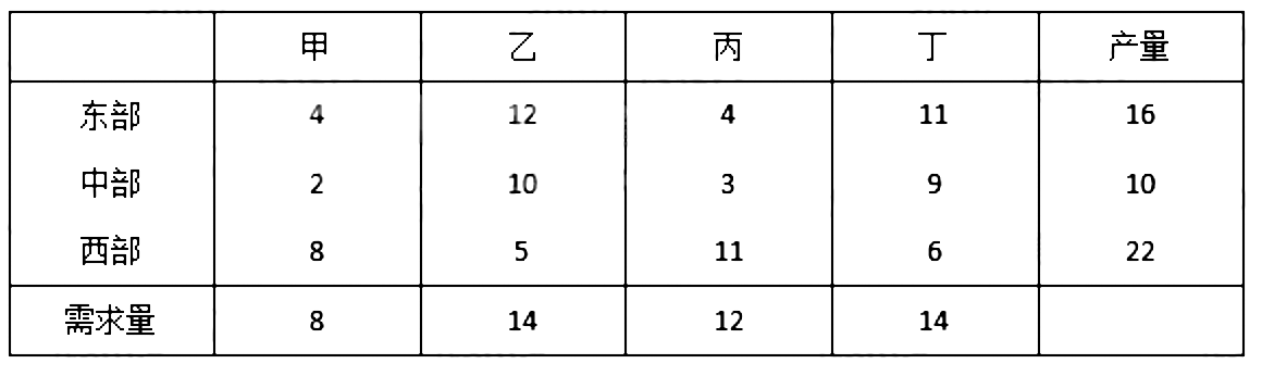 某公司有东部、中部、西部三个生产基地,生产的产品需要运送带甲、乙、丙、丁四个市场,从生产基地到各个市场的单位运价及产量和需求量如表所示,完成该运输任务所需的最小运费为()。