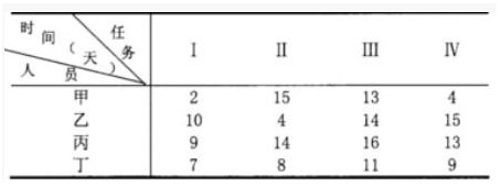 某项目有Ⅰ、Ⅱ、Ⅲ、Ⅳ四项不同任务,恰有甲、乙、丙、丁四个人去完成各项不同的任务.由于任务性质及每人的技术水平不同,他们完成各项任务所需时间也不同,具体如下表所示: