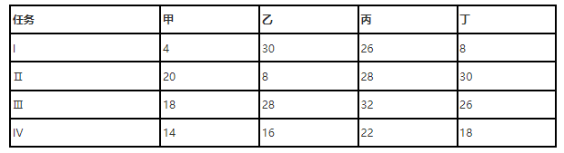 某企业承接了一项工程,该工作分为Ⅰ、ll、II、Ⅳ四项任务,甲、乙、丙、丁四个项目组完成各项任务的时间如表所示,为实现最优配置,第Ⅳ项任务应由 ( ) 来完成。