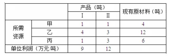 某企业需要采用甲、乙、丙三种原材料生产Ⅰ、Ⅱ两种产品。生产两种产品所需原材料数量、单位产品可获得利润以及企业现有原材料数如表所示: