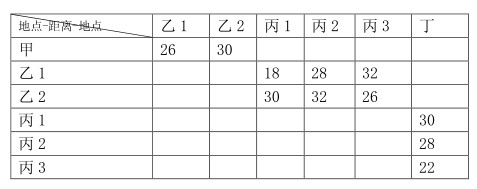 某公司从甲地向丁地运送物资,运送过程中先后需要经过乙、丙两个中转站,其中乙中转站可以选择乙1 和乙2 两个可选地点,丙中转站可以选择丙 1、丙 2 和丙 3 三个可选地点,各相邻两地之间的距离如表所示,则甲地到丁地之间的最短距离为(66)。
