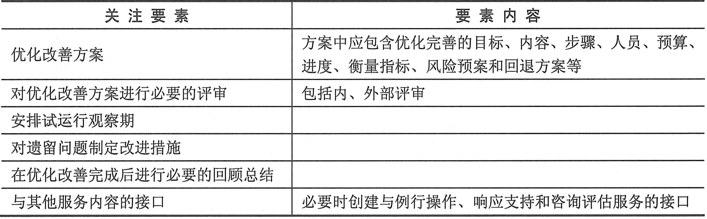 优化改善运维是指运维人员通过提供调优改进,达到提高设备性能或管理能力的目的。优化改善运维的相关要素如下表所示。