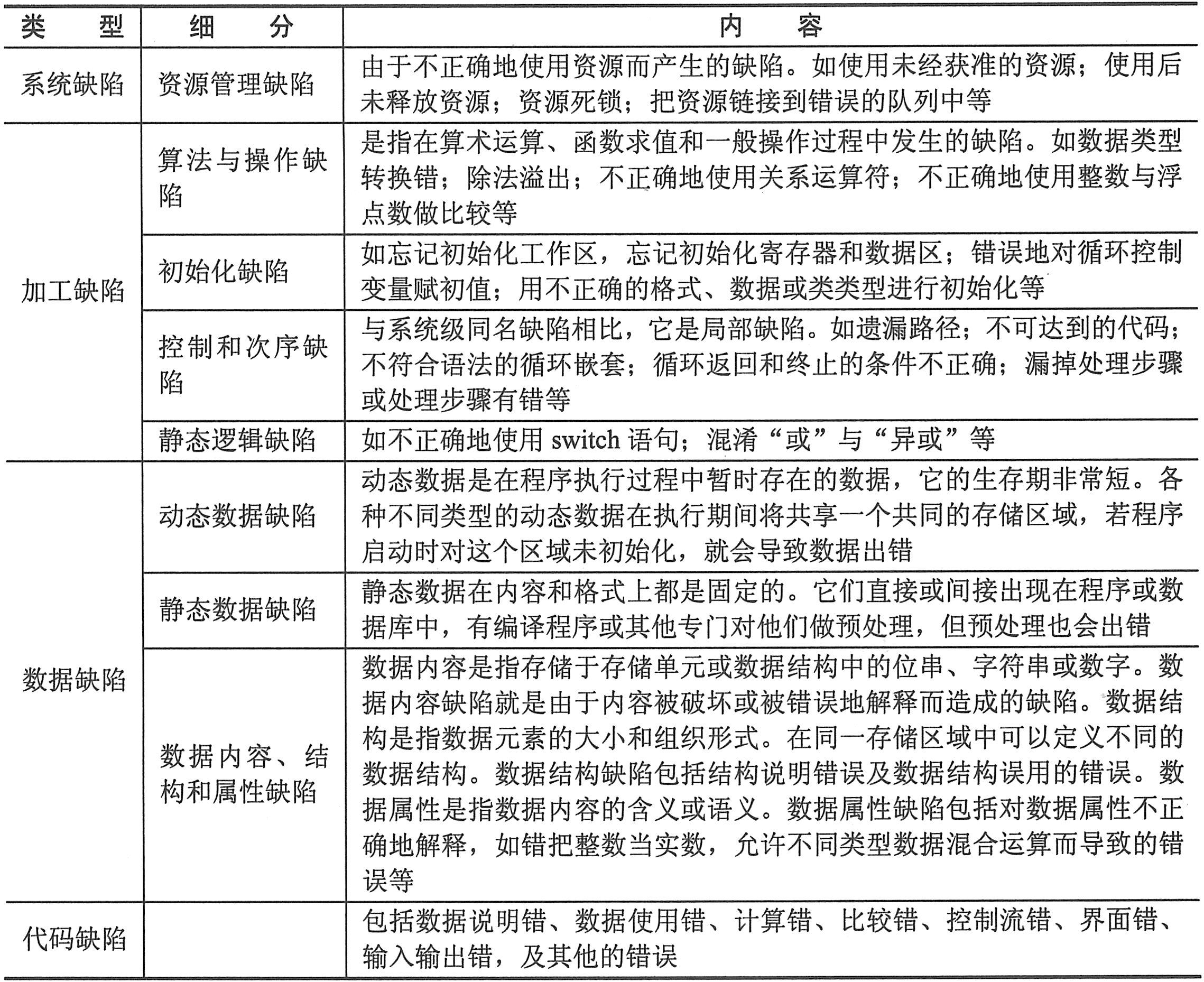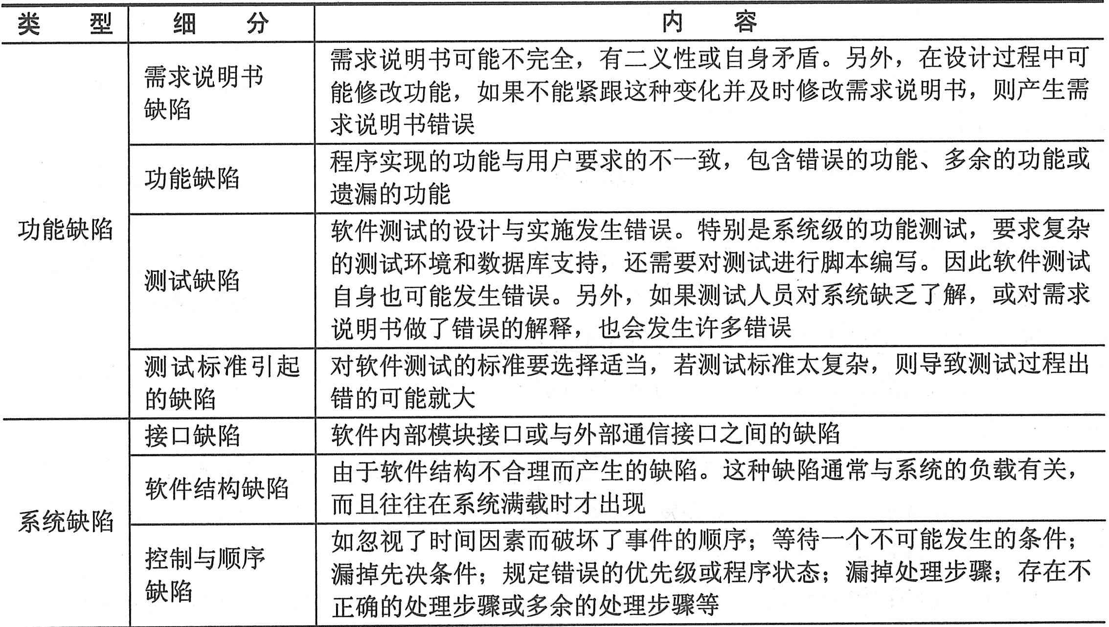 从软件测试观点出发,信息系统软件缺陷可以分为五大类,如下表所示。