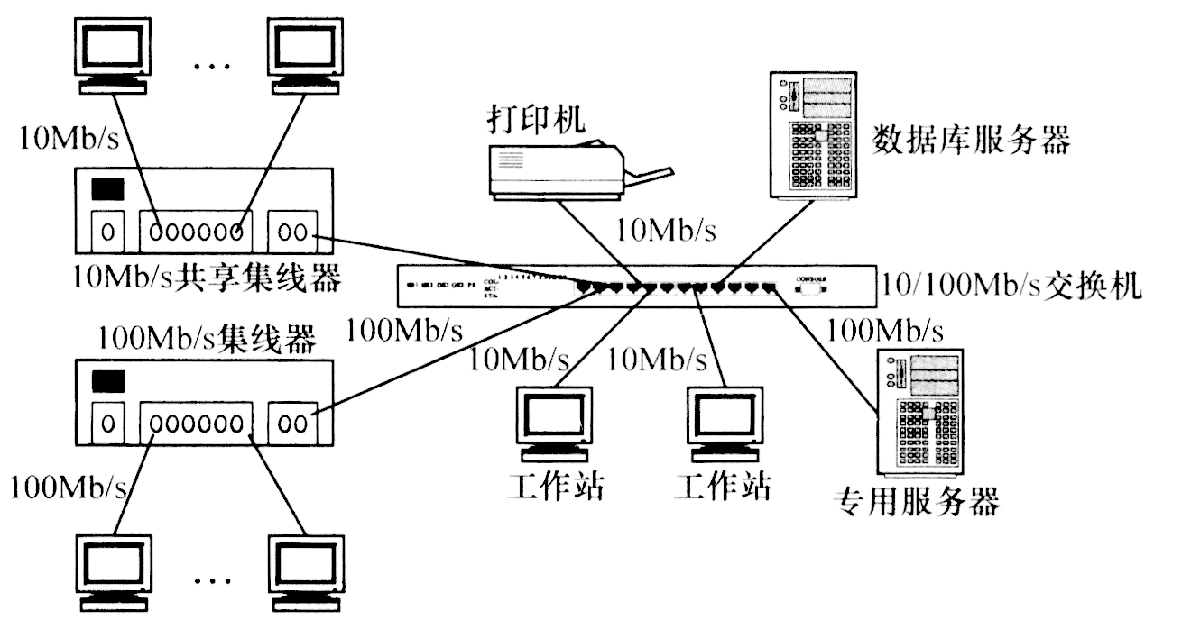 以太网使用的CSMA/CD是一种竞争式的介质访问控制协议,因此从本质上说它在网络负载较低时性能不错,但如果网络负载很大时,冲突会很常见,因此导致网络性能的大幅下降。为了解决这一瓶颈问题,“交换式以太网”应运而生,这种系统的核心是使用交换机代替集线器。交换机的特点是,其每个端口都分配到全部10Mb/s的以太网带宽。若交换机有8个端口或16个端口,那么它的带宽至少是共享型的8倍或16倍(这里不包括由于减少碰撞而获得的带宽)。