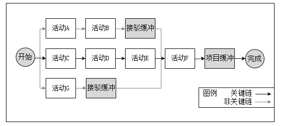 关键链法(CCM)是一种进度规划方法,允许项目团队在任何项目进度路径上设置缓冲,以应对资源限制和项目不确定性。这种方法建立在关键路径法之上,考虑了资源分配、资源优化、资源平衡和活动历时不确定性对关键路径(通过关键路径法来确定)的影响。关键链法引入了缓冲和缓冲管理的概念。在关键链法中,也需要考虑活动持续时间、逻辑关系和资源可用性,其中各活动持续时间中不包含安全冗余,它用统计方法确定缓冲时段,作为各活动的集中安全冗余,放置在项目进度路径的特定节点,用来应对资源限制和项目不确定性。资源约束型关键路径就是关键链。