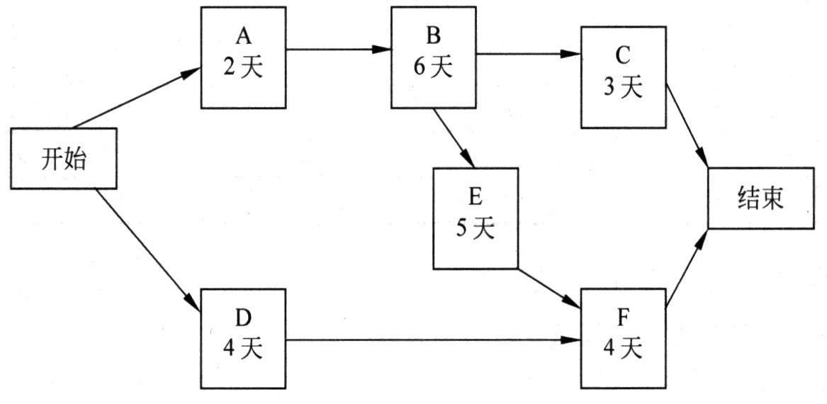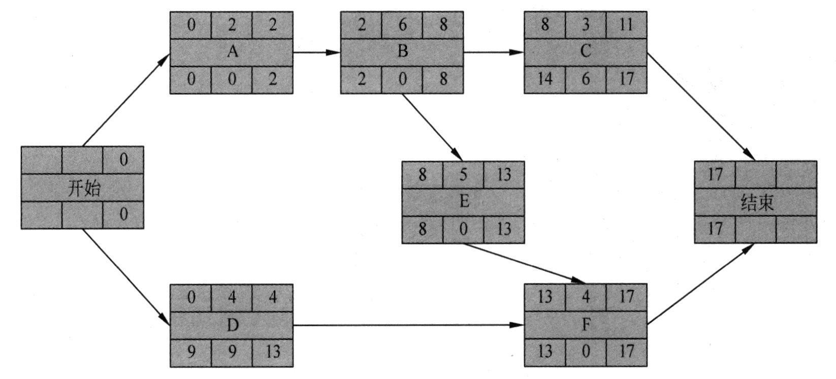 可根据以上任一条来判断各活动是否是关键路径上的活动,从网络图中不难看出本项目的关键路径是A—B—E—F,项目工期为17天。