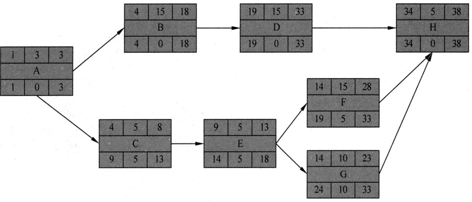 (1)根据总浮动时间为0的活动位于关键路径,很容易得到本项目的关键路径为A—B—D—H,项目工期为38天。