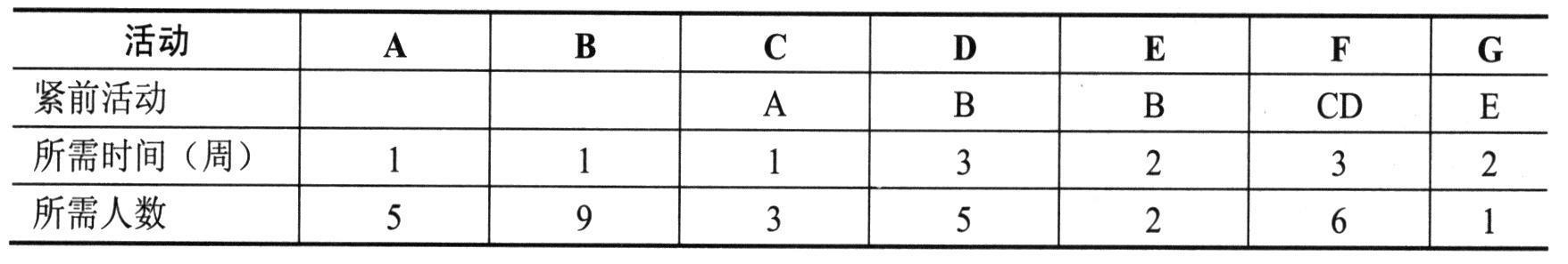 例:某项目包括A、B、C、D、E、F、G共7个活动,各个活动的紧前活动、所需时间、所需人数如下表所示,计算该项目的工期,按此工期,整个项目至少需要多少人?