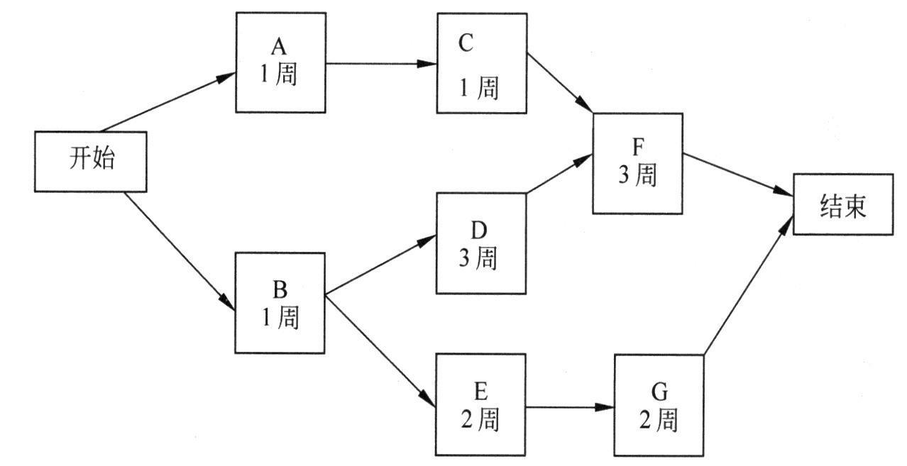 从图中可以看出路径B—D—F历时最长,为关键路径,该项目工期为B、D、F工期之和,即7周。