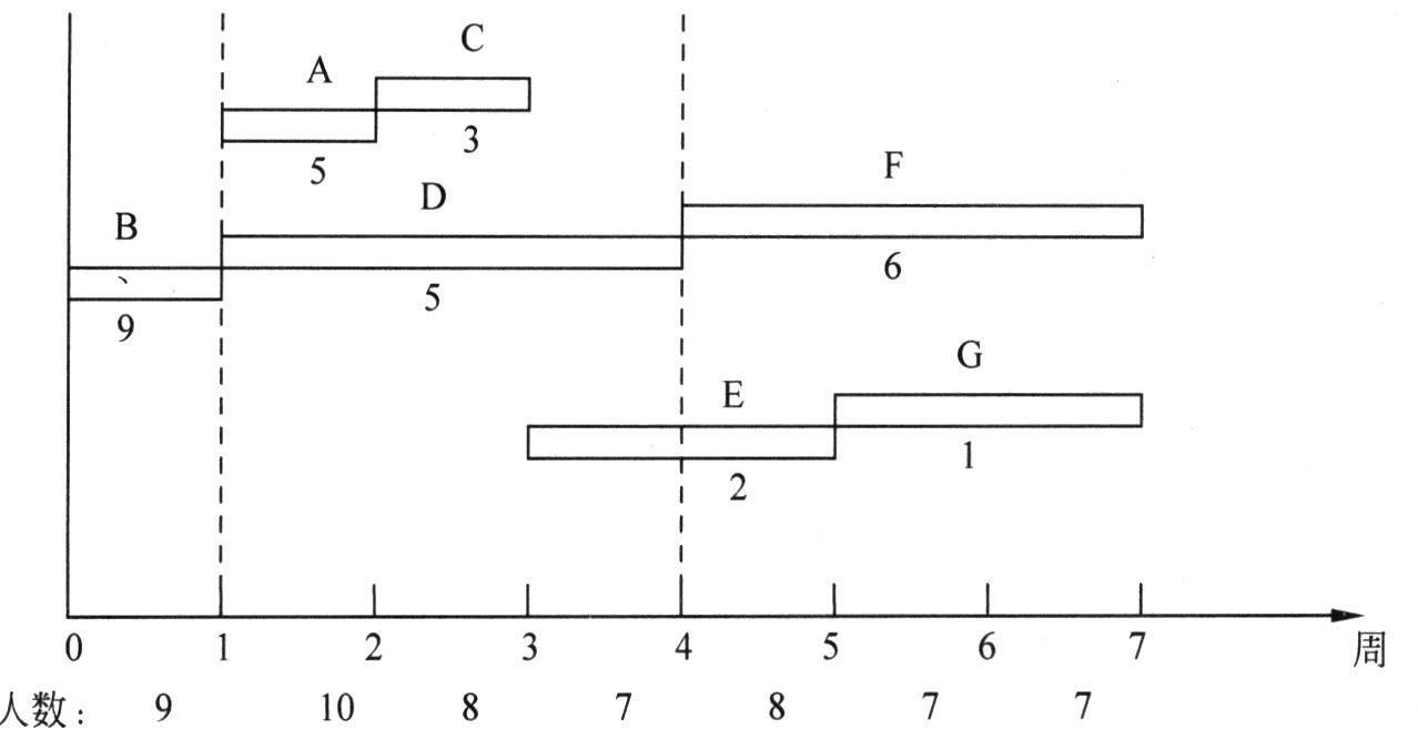 甘特图中活动B、D、F是关键路径上的活动,其时间安排是确定的,B为第1周,D为2、3、4周,F为5、6、7周,横坐标表示以周为单位的时间,表示活动的横道下面标出了各活动所需要的人数。按照逻辑关系,A、C需要在F之前完成,即A、C可安排在0~4周之间,图中虚线表示;E、G需要安排在B之后,且结束时间不能超过7周,所以E、G可安排在1~7周之间,图中用虚线表示。