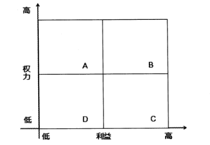 下图是权力/利益方格的示例,处于B区的干系人对项目的权力很大,并且对项目的结果也很关注,应当重点管理;处于A区的干系人权力大但对项目结果关注度低,争取A区干系人的支持有利于项目成功,所以要让其满意;C区干系人权力低,但对项目结果的关注度高,所以要随时告知其项目状态,维持其满意程度;D区干系人权力低,对项目结果关注度也低,可以花比较少的精力监督他们即可。