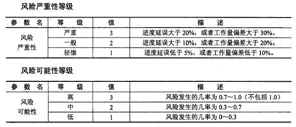 其中,对项目进度延误、工作量偏差的风险严重性等级和风险可能性等级如下表所示: