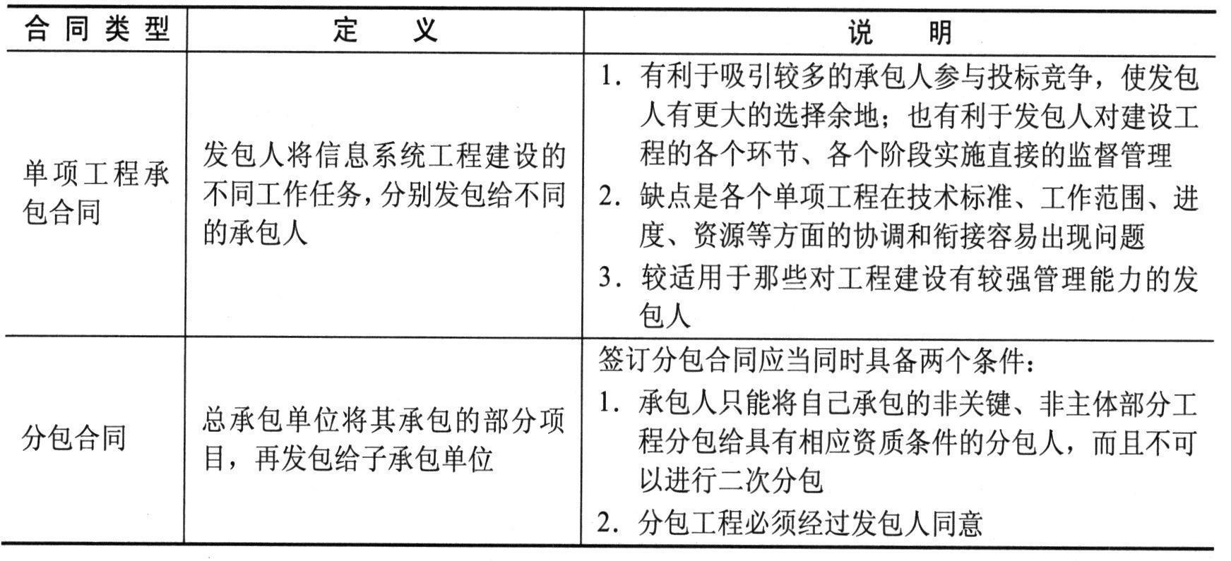项目合同按信息系统范围一般可划分为三种类型,如下表所示。