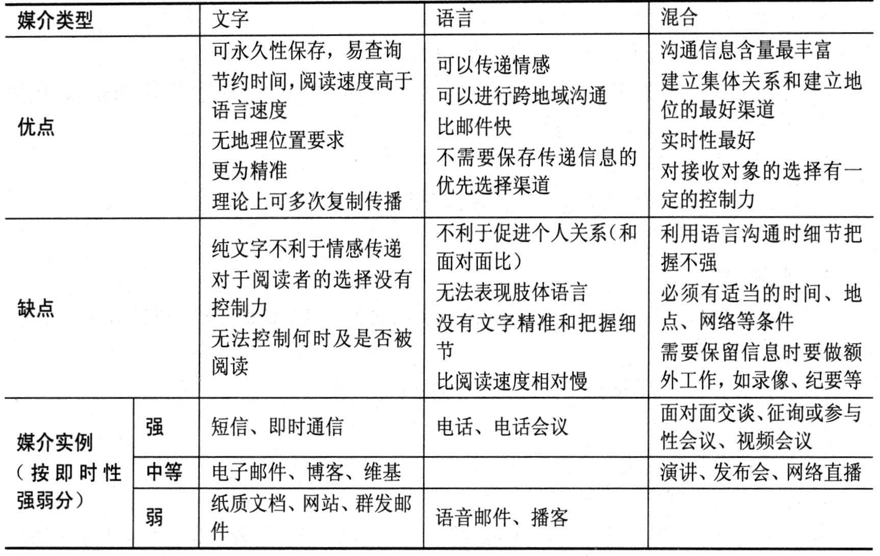下表列出了沟通媒介类型的优缺点以及按沟通即时性强弱列举的各媒介类型实例。在沟通中选择合适的媒介可以促进沟通过程的顺利进行。