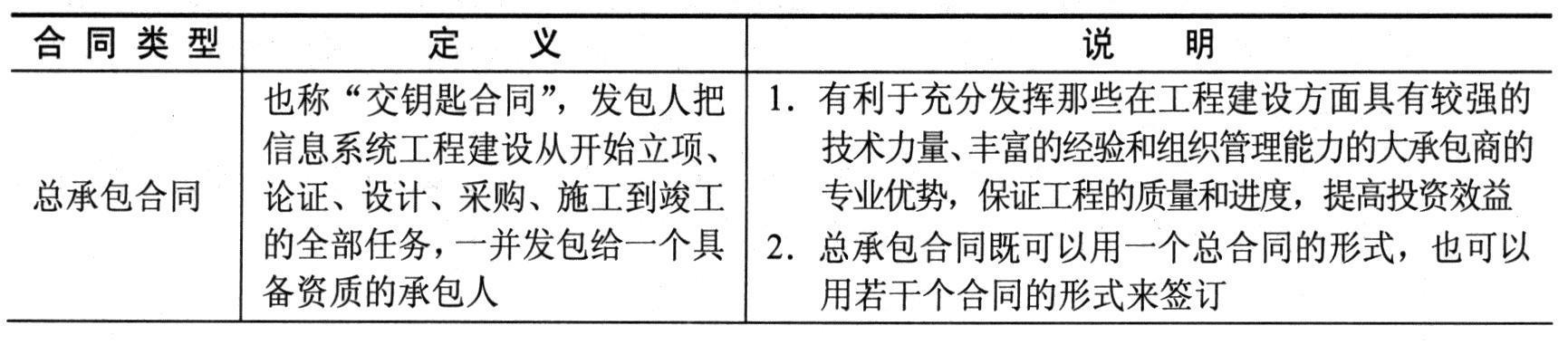 项目合同按信息系统范围一般可划分为三种类型,如下表所示。