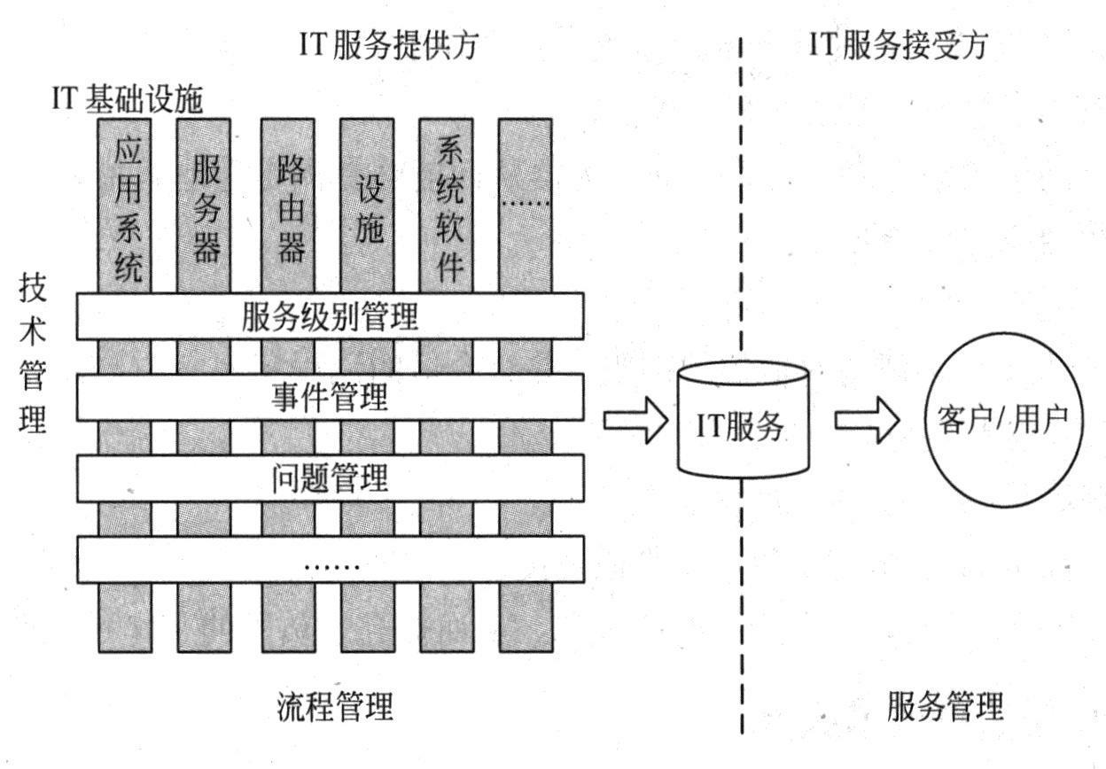 和面向技术的IT管理方法如网络管理和IT系统管理不同,IT服务管理的特点是采用面向过程的方法,它强调持续改进的理念,以客户需求和为客户提供的IT服务为中心,而非关注于单纯的IT系统。