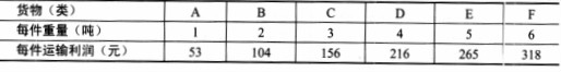 用一辆载重量为10吨的卡车装运某仓库中的货物(不用考虑装车时货物的大小),这些货物单件的重量和运输利润如下表。适当选择装运一些货物各若干件,就能获得最大总利润(54)元。