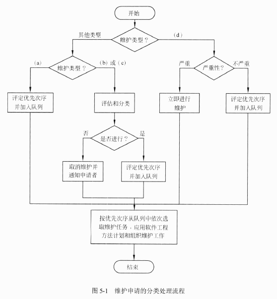 对于软件维护申请的处理,首先需要确定维护工作的类型,不同类型的维护工作,其处理流程往往不同,图5-1是区分不同维护类型的典型处理流程,请将表5-1中代表维护类型的序号(1)〜(4)填入图5-1的(a)〜(d)。