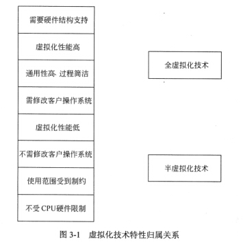 当前虚拟化的实现技术主要有全虚拟化和半虚拟化两种,请用200字以内的文字说明两种虚拟化技术的主要差别,并用箭线指出图3-1所示的虚拟化特性分属哪种虚拟化技术。