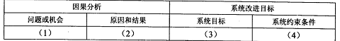 (9分) 因果分析是问题分析阶段一项重要技术,可以得出对系统问题的真正理解,并且有助于得到更具有创造性和价值的方案。请将题目中所列(a) ~ (i)各项内容填入表中(1) ~ (4)对应位置。 表1-1问题、机会、目标和约束条件
