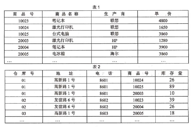 某公司的商品(商品号,商品名称,生产商,单价)和仓库(仓库号,地址,电话,商品号,库存量)两个实体之间的关系如表1和表2所示。