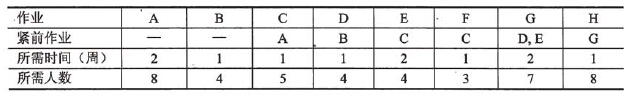 某工程包括A、B、C、D、E、F、G、H八个作业,各个作业的紧前作业、所需时间和所需人数如下表所示(假设每个人均能承担各个作业):