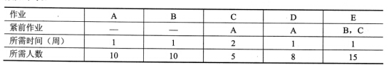 某项目包括A、B、C、D、E五个作业,各个作业的紧前作业、所需时间和所需人数如下表: