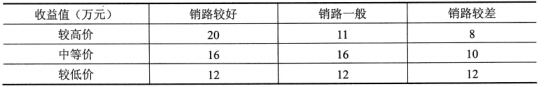 某企业开发了一种新产品,拟定的价格方案有三种:较高价、中等价、较低价。估计这种产品的销售状态也有三种:销路较好、销路一般、销路较差。根据以往的销售经验,他们算出,这三种价格方案在三种销路状态下的收益值如下表: