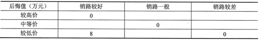企业一旦选择了某种决策方案,在同样的销路状态下,可能会产生后悔值(即所选决策方案产生的收益与最佳决策收益值的差值)。例如,如果选择较低价决策,在销路较好时,后悔值就为8万元。因此,可以根据上述收益值表制作后悔值表如下(空缺部分有待计算):