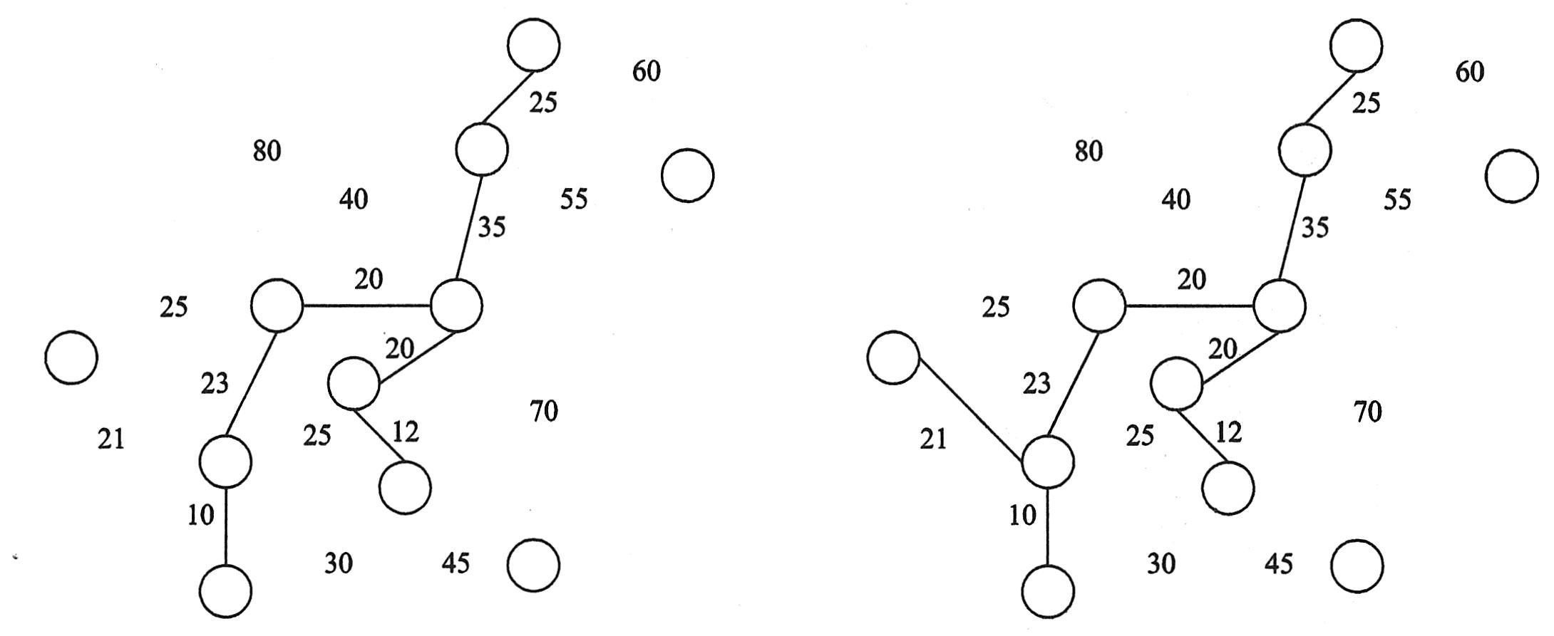 设已知G=(VE)是一个带权连通无向图,顶点V={0,1,2,…,n-1}。设U是构造生成树过程中已被考虑在生成树上的顶点的集合。初始时,U只包含一个出发顶点。设T是构造生成树过程中已被考虑在生成树上的边的集合,初始时T为空。如果边(ij)具有最小代价,且iUjV-U,那么最小生成树应包含边(ij)。把j加到U中,把(ij)加到T中。重复上述过程,直到U等于V为止。这时,T即为要求的最小生成树的边的集合。