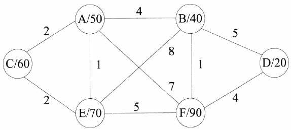 已知有6个村A〜F,相互间的道路距离(单位:里)如下图所示。计划在其中某村建一所学校。据统计,各村希望来上学的学生人数分别为50、40、60、20、70、90。为使全体学生上学所走的总距离最短,学校应建在(58)村。