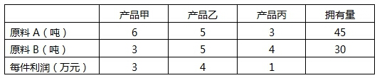 某厂准备生产甲、乙、丙三种产品,生产每件产品所需的A、B两种原料数量,能获得的利润,以及工厂拥有的原料数量如下表: