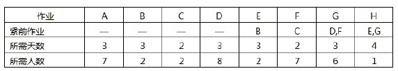 某工程项目包括8个作业A~H。各作业的紧前作业、所需天数、所需人数见下表:
