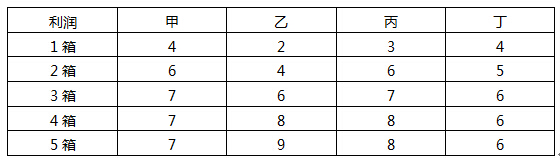 某批发站准备向甲、乙、丙、丁四家小商店供应5箱商品。批发站能取得的利润(单位:百元)与分配的箱数有关(见下表)。