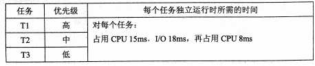 在一个单CPU的计算机系统中,采用可剥夺式(也称抢占式)优先级的进程调度方案,且所有任务可以并行使用I/O设备。下表列出了三个任务T1、T2 、T3 的优先级、独立运行时占用CPU和I/O设备的时间。如果操作系统的开销忽略不计,这三个任务从同时启动到全部结束的总时间为(47)ms ,CPU的空闲时间共有(48)ms 。