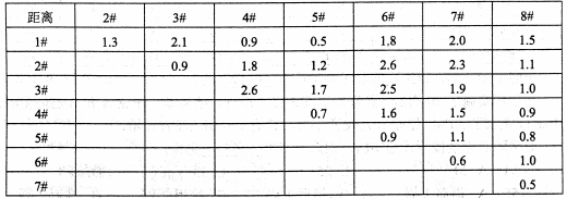 已知八口海上油井(编号从1#到8#) 相互之间的距离(单位:海里)如下表所示,其中1#油井离海岸最近为5海里。现从海岸开始铺设输油管道,经1#油井将这些油井都连接起来,管道的总长度至少为( ) 海里(为便于计量和维修,管道只能在油井处分叉)。
