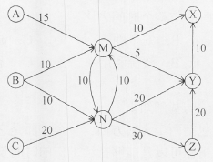 X、Y、Z 是某企业的三个分厂,每个分厂每天需要同一种原料20吨,下图给出了邻近供应厂A、B、C的供应运输路线图,每一段路线上标明了每天最多能运输这种原料的吨数。根据该图可以算出,从A、B、C三厂每天最多能给该企业运来这种原料共( )吨。
