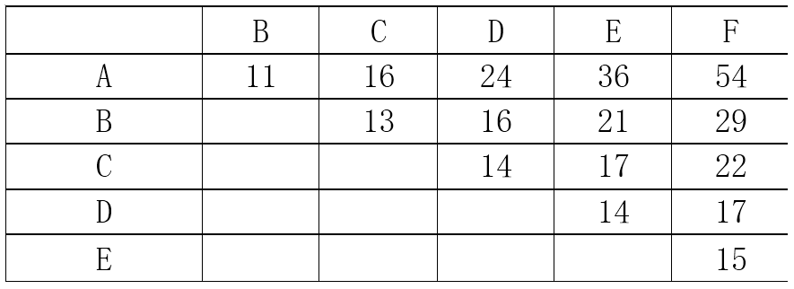 下表记录了六个结点A、B、C、D、E、F之间的路径方向和距离。从A到F的最短距离是( )。