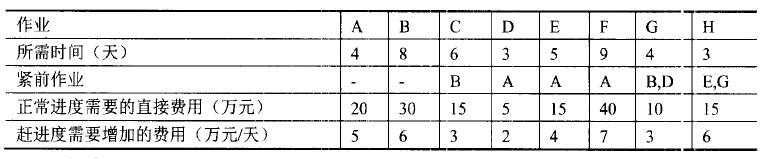 某项目包括8个作业A~H,每天需要间接费用5万元,完成各作业所需的时间与直接费用、赶进度时每天需要增加的费用以及作业之间的衔接关系见下表。根据这些数据,以最低成本完成该项目需要()天。