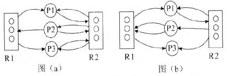 在进程资源有向图中,圆圈表示进程,方框表示资源,方框内的小圆数表示资源数。当有向边(或称请求边)由进程指向资源时,表示申请一个资源;当有向边(或称分配边)由资源指向进程时,表示获得一个资源。假设系统中存三个进程P1、P2和P3,两种资源R1、 R2,且R1的资源数等于3, R2的资源数等于3。如果进程资源图如图(a)和图b)所示, 那么图(a)中(46):图(b)中(47)。