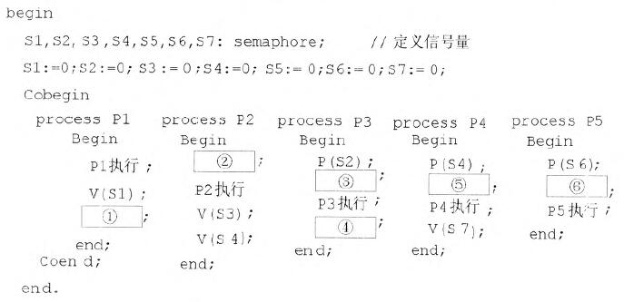 若用pv操作控制这5个进程的同步与互斥的程序如下,那么程序中的空①和空②处应分別为(49);空③和空④处应分别为(50);空⑤和空⑥处应分别为(51)。