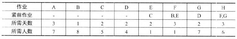 某项目有8个作业A?H,每个作业的紧前作业、所需天数和所需人数见下表。由于整个项目团队总共只有9人,各个作业都必须连续进行,中..