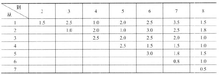 某乡8个小村(编号为1?8)之间的距离如下表(单位:km)。1号村离水库最近,为5km,从水库开始铺设水管将各村连接起来,最少需要铺设(55)长的水管(为便于管理和维修,水管分叉必须设在各村处)。