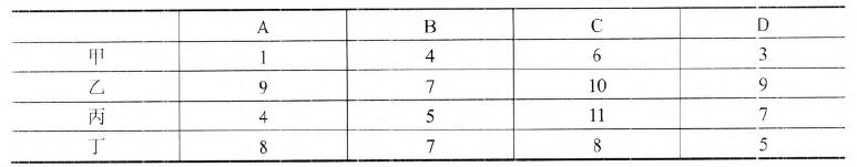 甲、乙、丙、丁四个任务分配在A、B、C、D四台机器上执行,每台机器执行一个任务,所需的成本(单位:百元)如下表所示。适当分配使总成本最低的最优方案中,任务乙应由机器(57)执行。