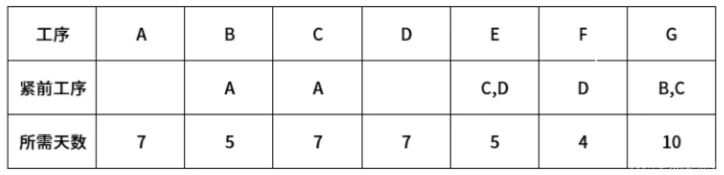 某项目共有 A-G 七道工序,各道工序所需的时间(天数)以及工序之间的运行关系如下表。该项目计划的最短工期为( )天。假设每道工序只需要一人做,都可以做所有各道工序,但不能同时做多道工序,那么该项目至少需要( )。