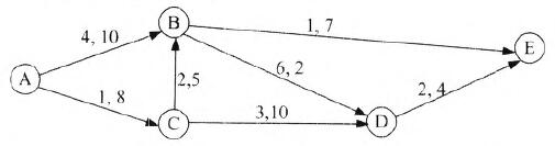 某运输网络图(见下图)有A?E五个结点,结点之间标有运输方向箭线,每条箭线旁标有两个数字,前一个是单位流量的运输费用,后一个是该箭线所允许的单位时间内的流量上限。从结点A到E可以有多种分配运输量的方案。如果每次都选择最小费用的路径来分配最大流量,则可以用最小总费用获得最大总流量的最优运输方案。该最优运输方案中,所需总费用和达到的总流量分别为(56)。